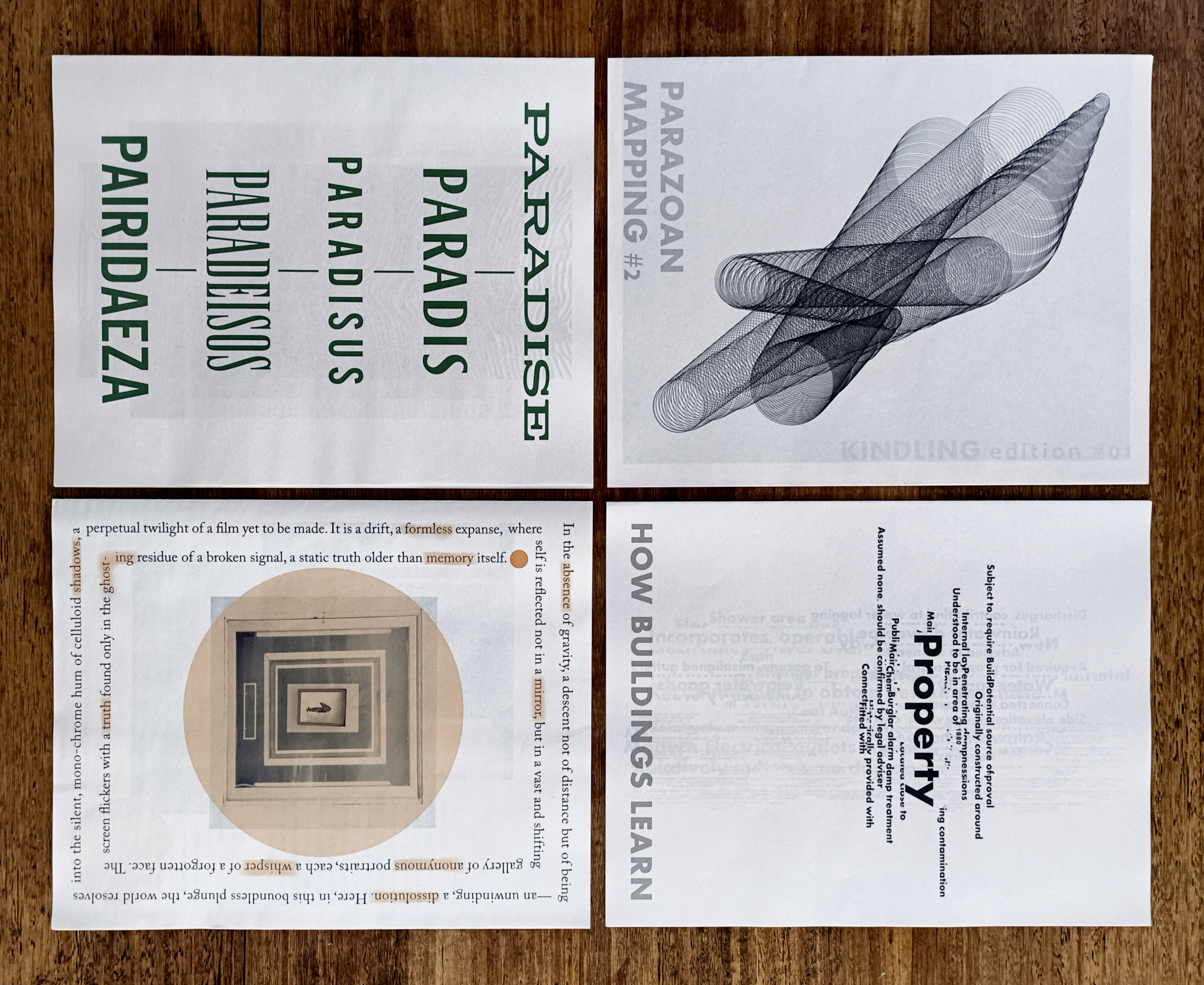 KINDLING explores the intersection of digitally shared sound, printed image and text, worked together or placed against the other to see/hear what might happen. Through this process, KINDLING works to open a site of conversation for a community of makers, listeners and readers. While it’s material form may be less-than-precious, ephemeral and even recyclable, we hope the ideas, feelings or actions it may encourage will remain.